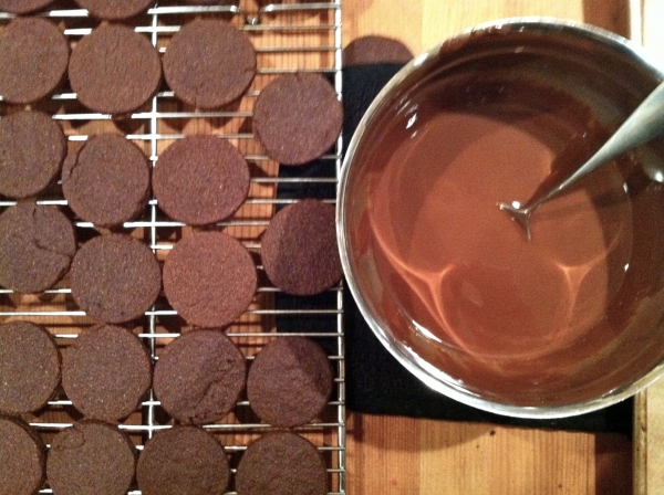 Dip cookies in chocolate-mint mixture and lay on parchment paper.
